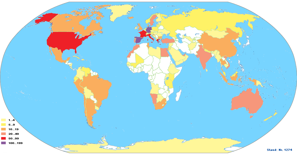 Hier ist farblich kodiert die Anzahl der Sandproben je Land dargestellt. (Sandprobenanzahl: siehe links unten in der Karte)